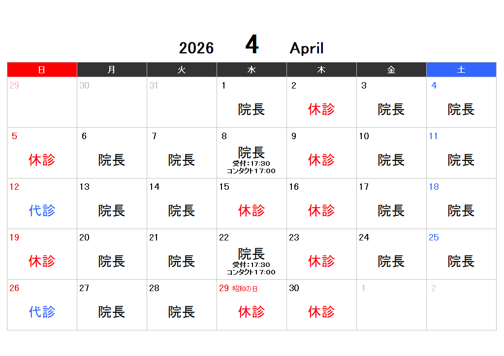 ※コンタクトレンズの処方は、検査の性質上、受付終了時間の30分前にはご来院頂けますよう、お願い 申し上げます。 なお、コンタクトレンズの処方が初めての方は受付時間が17:30までとなります。 |